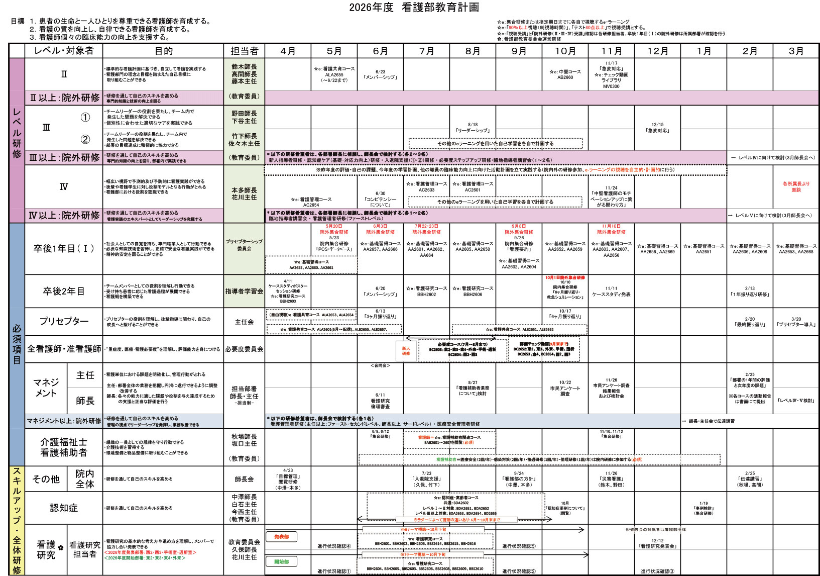 1. 看護職員の学習ニーズに見合った教育プログラムを提供し、学習活動を支援することにより、看護の質の向上と看護職員の仕事に対する満足感を高める。